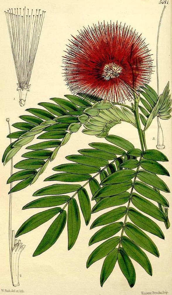 FabaceaeEl género Calliandra deriva del griego kalli y andros (hermoso y masculino), por sus llamativos estambres rojos, mientras haematocephala deriva también del griego y significa "cabezas de color sangre". Es un arbusto de origen Sudamericano (Brasil, Bolivia), y que se puede encontrar con uso ornamental (sobre todo en Sudamérica) aunque no es muy frecuente.