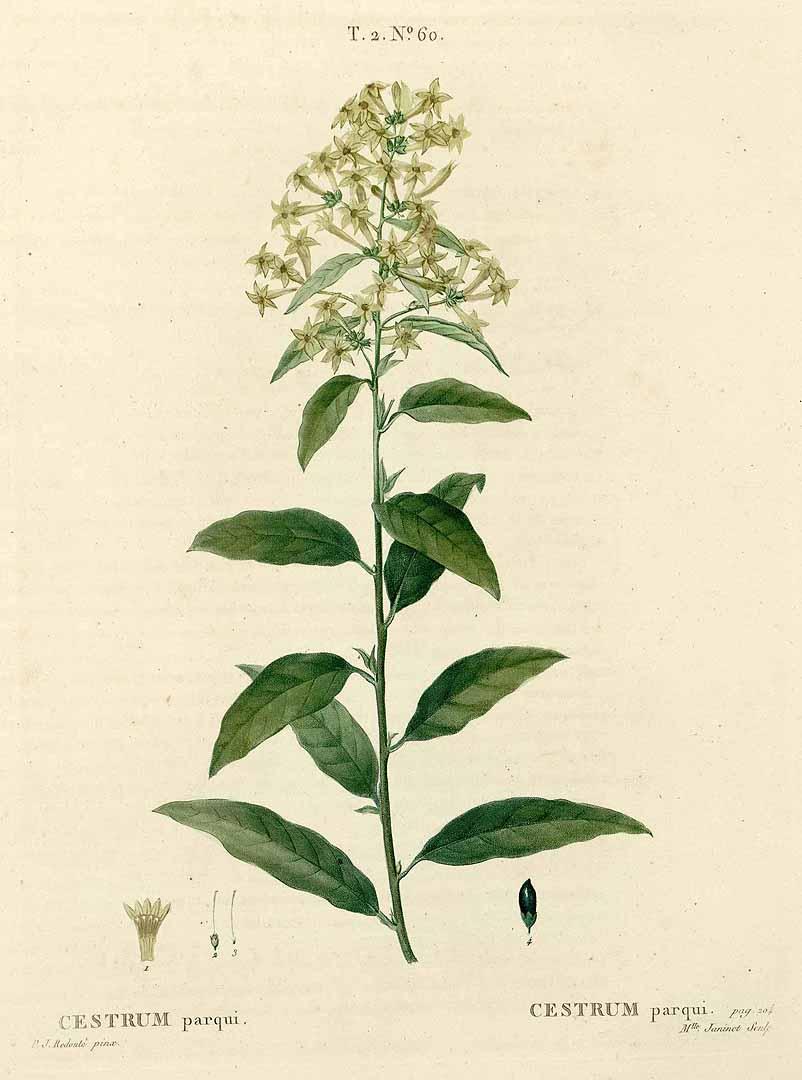 SolanaceaeEl género Cestrum engloba decenas de plantas solanáceas americanas, la mayor parte de ellas de Sudamérica. Todas ellas son bastante tóxicas por ingestión, y varias se han popularizado para su uso ornamental. El nombre del género deriva del griego kestron, 'buril', que al parecer utilizó Dioscórides para una planta similar a la menta. El epíteto parqui deriva de los nombre vernáculo en Chile.
